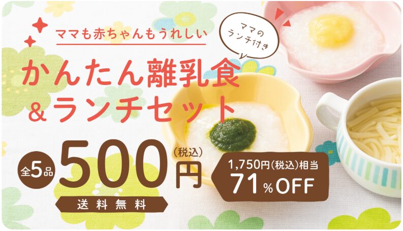 「すくすく子育てセット」は、離乳食作りをサポートする「きらきらステップシリーズ」の内容を試せるセットで、1都7県で利用でき、通常1,750円のところを71%OFFの500円(全5品)で利用できます