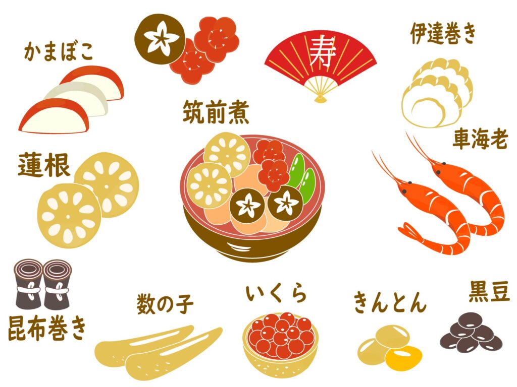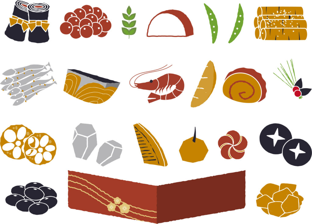 紅白のかまぼこ、金箔をあしらった伊達巻、艶やかな黒豆、そして鮮やかな海老。