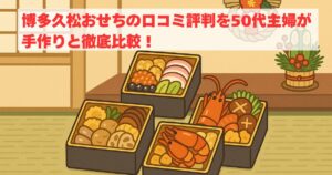 博多久松のおせちは口コミ評判でも高評価を集めており、50代主婦の私が手作りと比較した結果、味・品質・コスパすべてで満足できる内容でした。