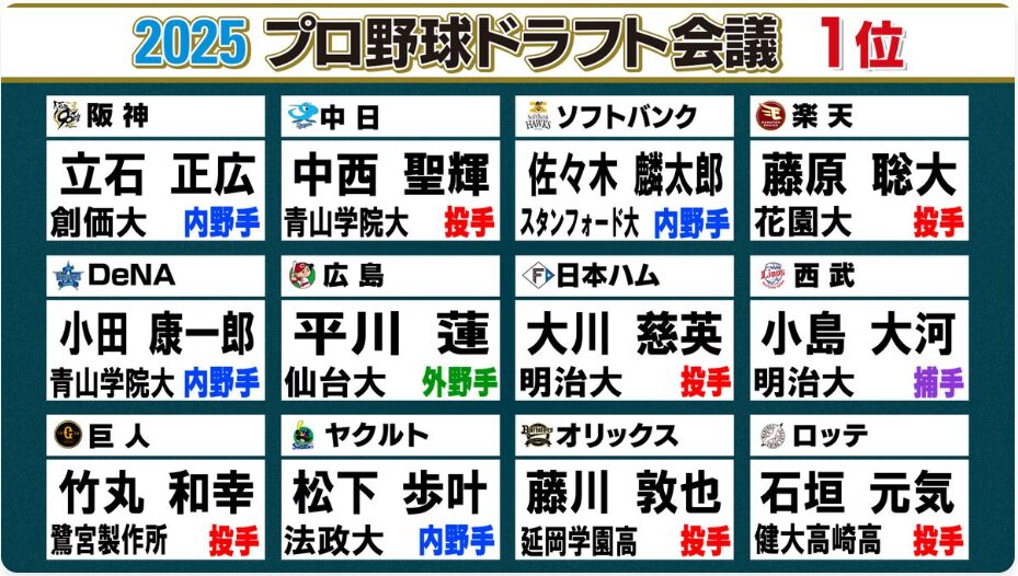 阪神タイガースが2025年ドラフト会議で1位指名(3球団競合の末に交渉権獲得)したのは、創価大学の内野手・立石正広選手。